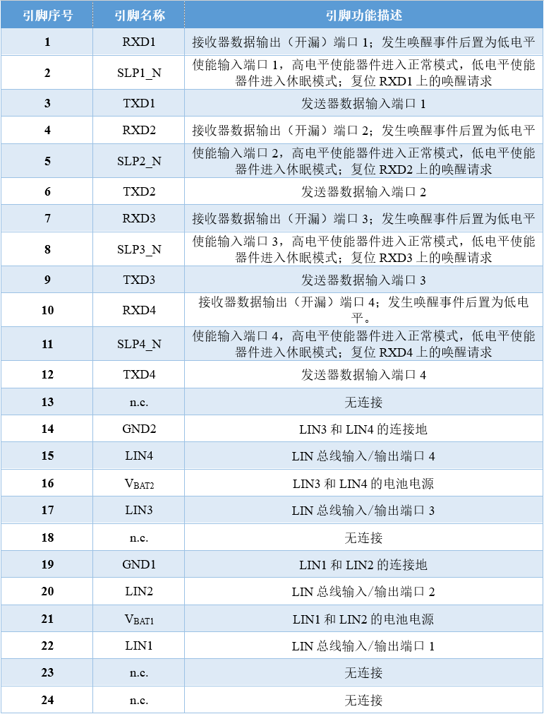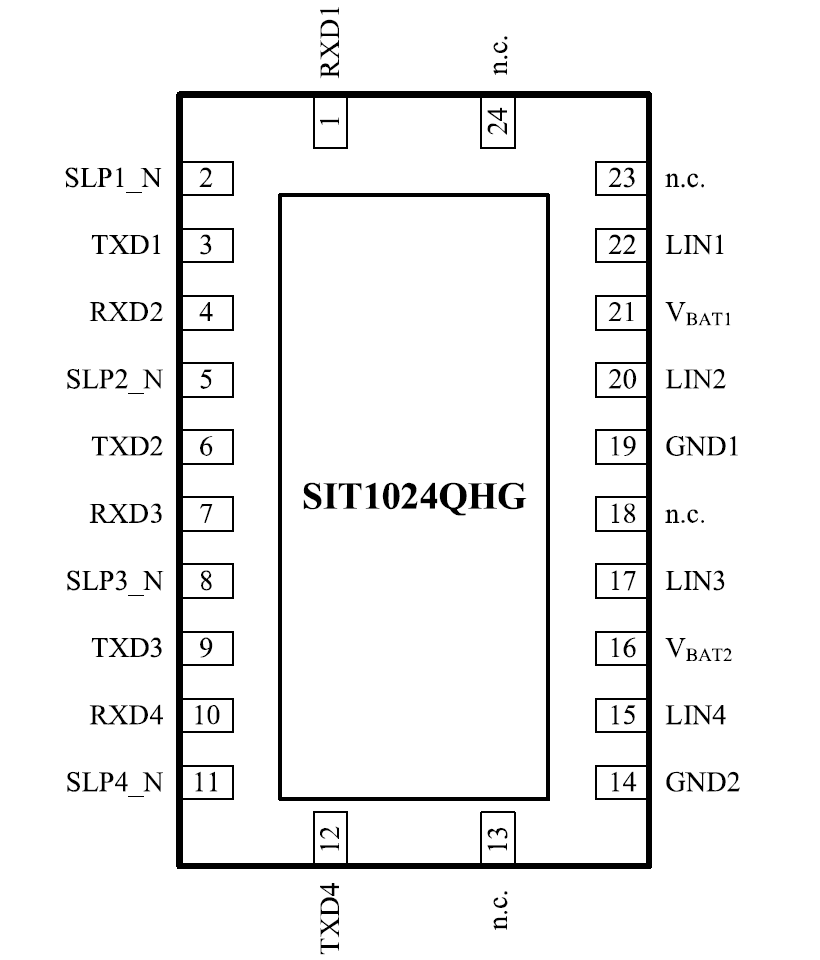 SIT1024Q是一個(gè)具有四個(gè)通道的LIN設(shè)備,其QFN封裝如圖8。每個(gè)通道都提供了獨(dú)立的控制模式(引腳 SLP1_N、SLP2_N、SLP3_N、SLP4_N為模式控制引腳),每個(gè)LIN通道的工作模式等同于單通道LIN收發(fā)器SIT1029Q,這使得LIN軟件驅(qū)動(dòng)程序可以重用。
