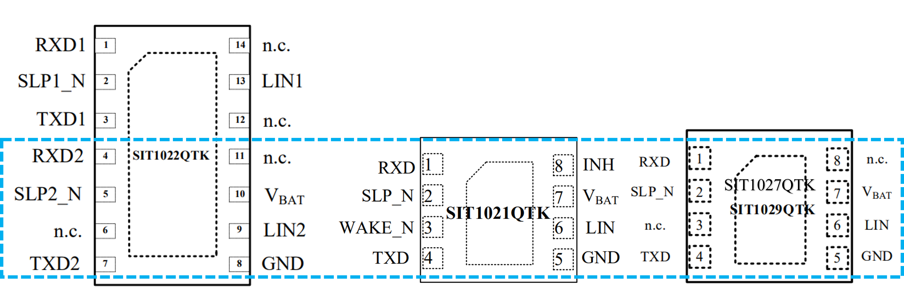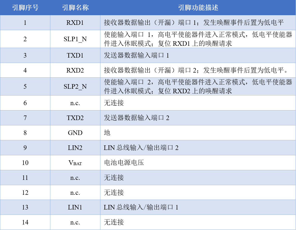 SIT1022Q包含兩個(gè)LIN收發(fā)器通道,每個(gè)通道提供獨(dú)立的模式控制(引腳SLP1_N、SLP2_N為模式控制引腳),為了支持LIN電路板設(shè)計(jì)的可擴(kuò)展性,SIT1022Q固定的下半部分兼容單通道LIN收發(fā)器,如SIT1021Q,SIT1027Q和SIT1029Q,這使得LIN軟件驅(qū)動(dòng)程序可以重用,其SOP封裝和DFN封裝如圖6,引腳功能如圖7。