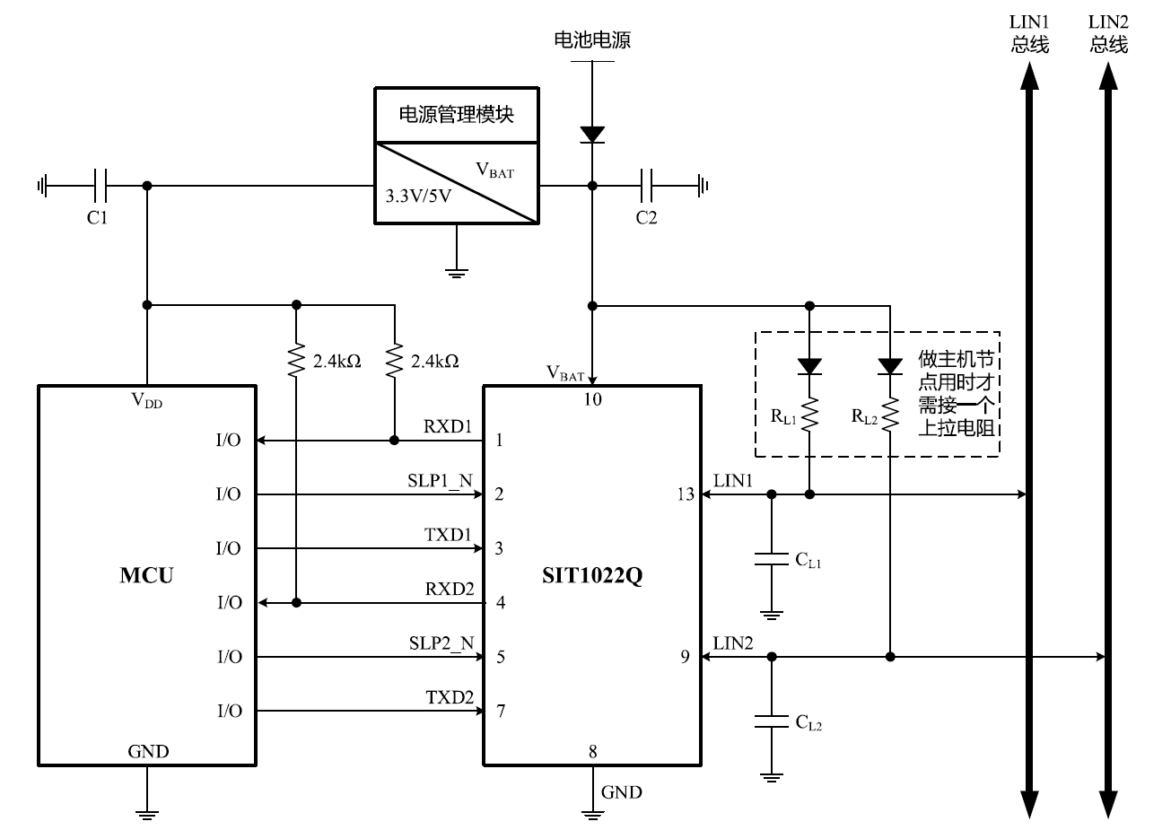 SIT1022Q和SIT1024Q的典型應(yīng)用示意圖分別如圖13、14所示,其作為主機(jī)節(jié)點(diǎn)使用時(shí)候,需要接一個(gè)二極管和上拉電阻RL。