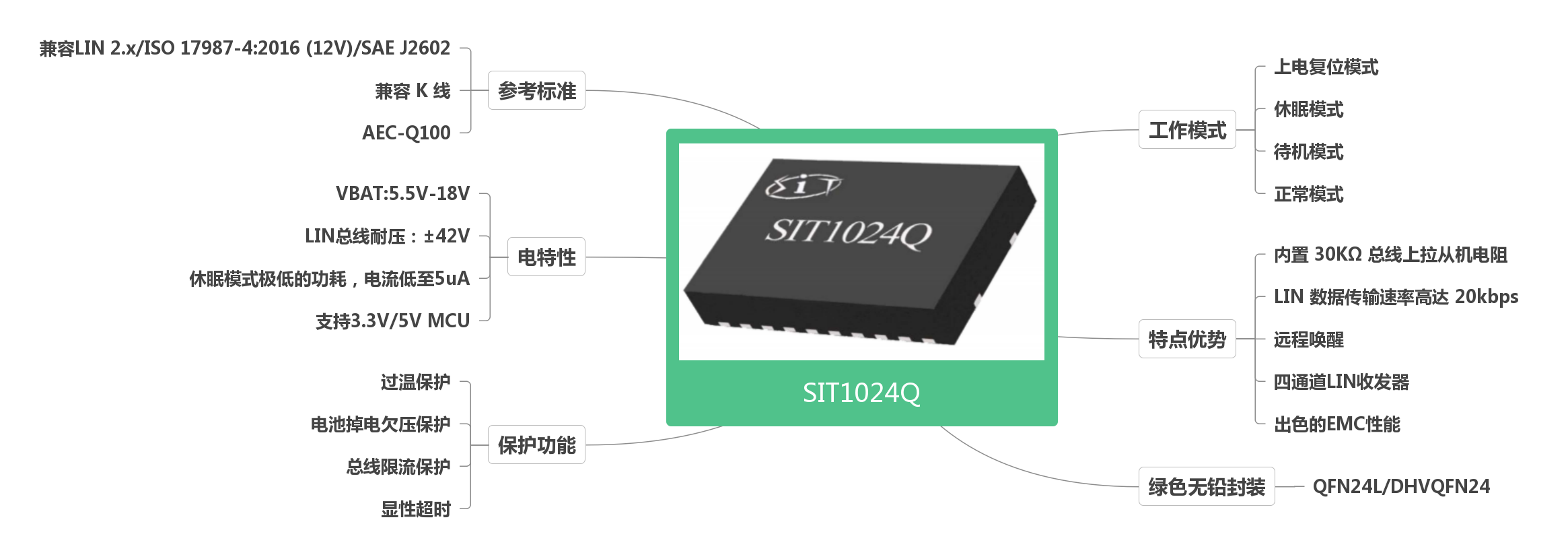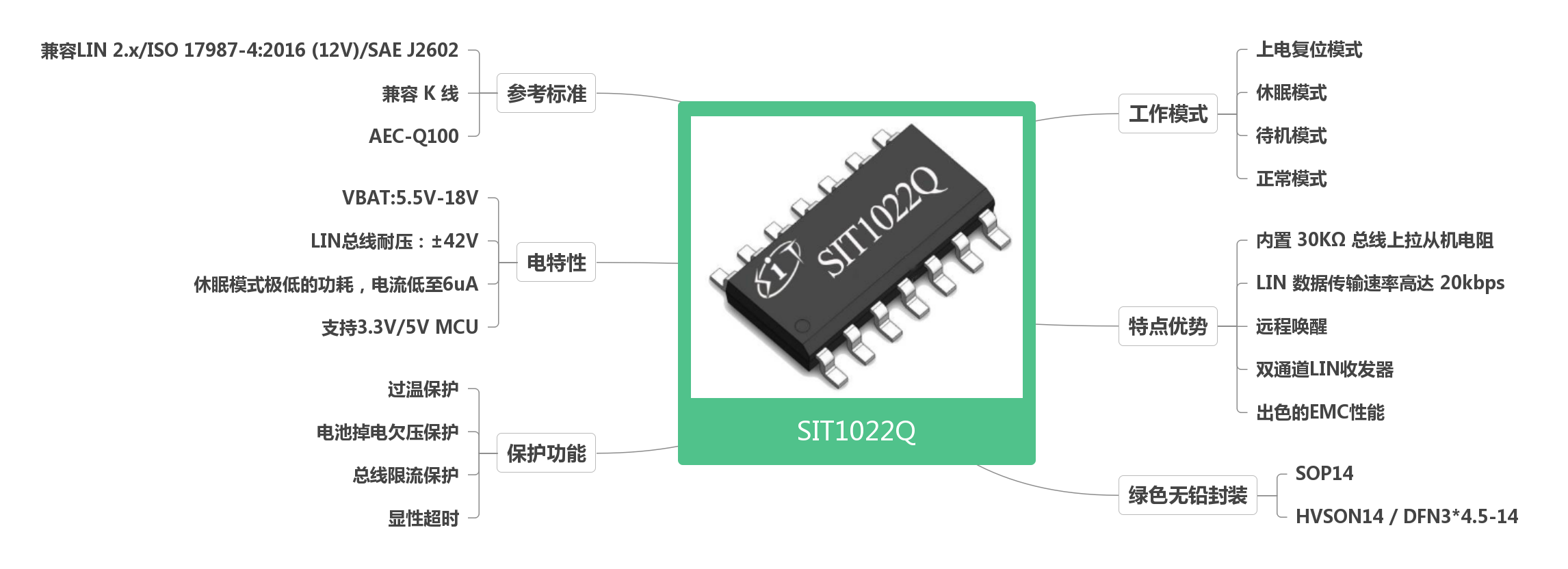 SIT1022Q/SIT1024Q是一款應(yīng)用于LIN協(xié)議控制器和物理總線之間的接口芯片,可應(yīng)用于乘用車和工業(yè)控制等領(lǐng)域,傳輸速率高達(dá)20Kbps。SIT1022Q/SIT1024Q在發(fā)送數(shù)據(jù)輸入端(TXDx)接收協(xié)議控制器發(fā)送的數(shù)據(jù)流,并將其轉(zhuǎn)換為具有最佳壓擺率和波形整形的總線信號;LIN總線上的輸入數(shù)據(jù)由SIT1022Q/SIT1024Q的接收器接收后,通過RXDx端口轉(zhuǎn)換成低壓的邏輯電平信號輸出至外部的微控制器。此器件兼容“LIN 2.x/ISO 17987-4:2016 (12V)/SAE J2602”標(biāo)準(zhǔn)。
