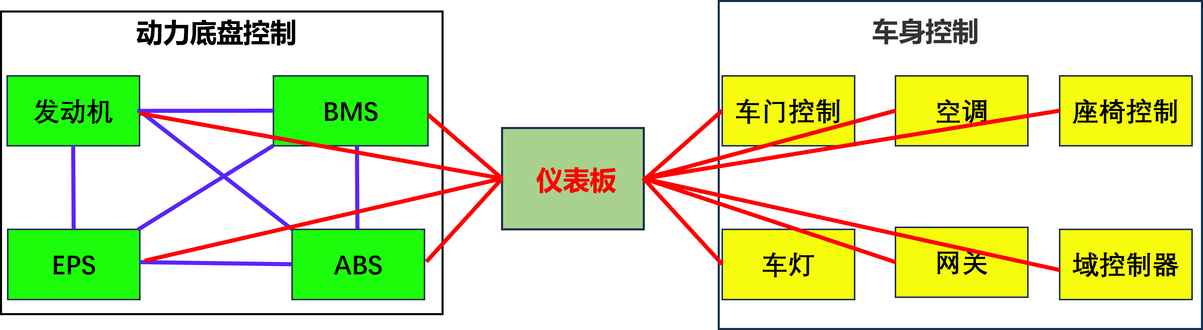 隨著汽車ECU越來越多,如ABS,電控門窗,電子燃油噴射裝置。如果仍然采用常規(guī)的點(diǎn)對點(diǎn)布線方式,如圖1所示,將會導(dǎo)致車上信號傳輸線數(shù)目的急劇增加,從而帶來線束的冗余及維修成本的提高。這就對汽車的線束分布及信息通訊提出了更高的要求??偩€技術(shù)可以實(shí)現(xiàn)信息的實(shí)時(shí)共享,解決了傳統(tǒng)布線方式中線束多,布線難,成本高等問題,CAN(Controller Area Network)總線技術(shù)應(yīng)運(yùn)而生,如圖2所示。
