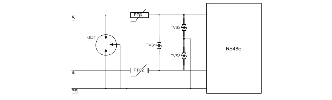 3,AB端口分別并聯(lián)熱敏電阻、TVS 到地,同時(shí)A,B之間并聯(lián)TVS器件的保護(hù)方案。